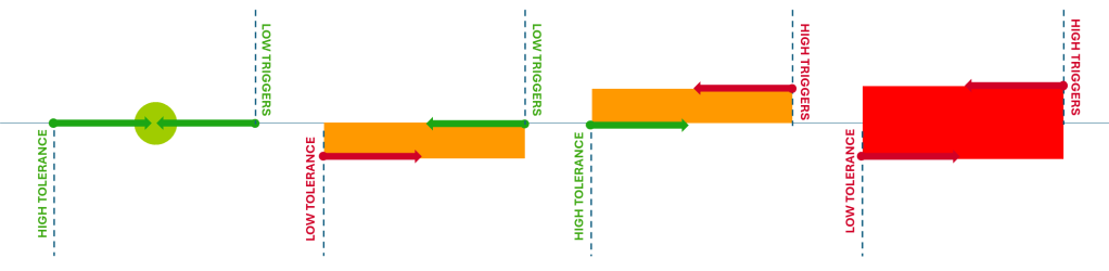 If your tolerance drops, however (you’re stressed or anxious or tired), you can imagine one hand slipping down. There’s now a gap that puts you at risk of getting a migraine. Similarly, if your tolerance stays high but your triggers increase (you skip dinner to go to a late-night movie with strobing lights in it), you can imagine your other hand rising. Again, there’s a gap that migraine can exploit. If both happen at the same time, and your tolerance is low and your triggers are high, now your hands are a long way apart. The gap is wide, and you’re at a much greater risk of getting a migraine.