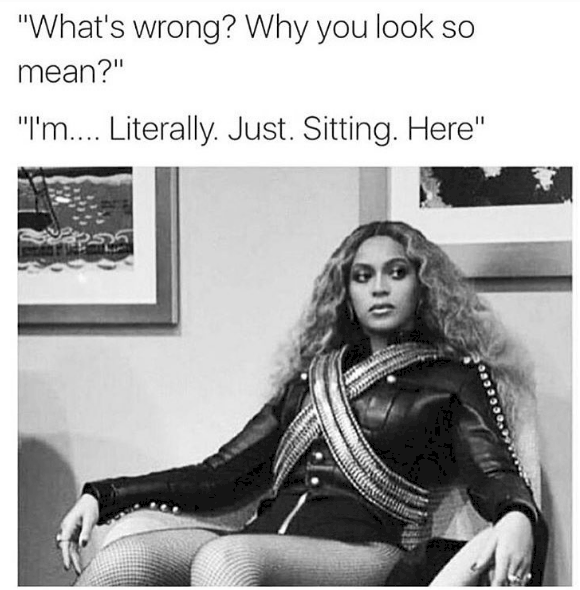 Curious to know a bit more about RBF and what’s going on, I did a quick bit of research. Here’s what Wikipedia says: “Resting b!@#$ face (RBF) is a facial expression that unintentionally creates the impression that a person is angry, annoyed, irritated, or contemptuous, particularly when the individual is relaxed, resting, or not expressing any particular emotion.”