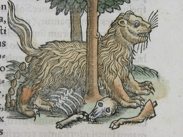 The Catoblepas – this small (sometimes) winged buffalo lives in Africa, near the source of the Nile. It has a neck as skinny as unraveled intestines, but a head so heavy it must drag it along the ground. This poor creature has bloodshot eyes covered in a thick main and a tail curled like a pig, but scaled like a snake. The Catoblepas eats only poisonous plants, and is a timid creature who prefers to keep to itself, but it will, if disturbed, kill you with a glance. Shy as he was, he was well enough known to make it into Medieval manuscripts and the notebooks of Lenardo da Vinci…